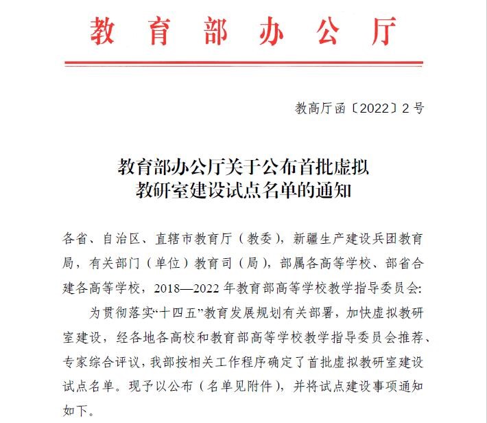 虚拟教研室建设试点由教育部组织实施,旨在以现代信息技术为依托,探索建设新型基层教学组织,打造教师教学发展共同体和质量文化,引导教师回归教学、热爱教学、研究教学,提升教育教学能力,为高等教育高质量发展提供有力支撑。